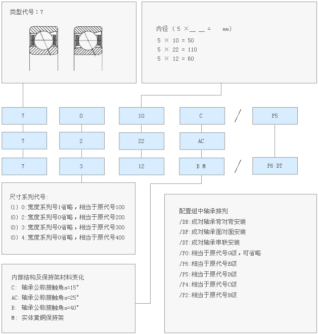 7000C型(∝=15°)、 7000AC型(∝=25°) 和7000B(∝=40°)该种轴承的锁口在的外圈上,一般内外圈不能分离,可承受径向和轴向的联合载荷以及一个方向的轴向载荷。承受轴向载荷的能力由接触角决定,接触角大,则承受轴向载荷的能力高。该种轴承能限制轴或外壳在一个方向的轴向位移。