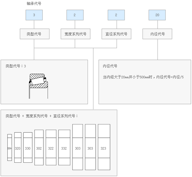 圆锥滚子轴承的类型代号为30000,圆锥滚子轴承为分离型轴承。一般情况下,尤其是在GB/T307.1-94《滚动轴承 向心轴承公差》中所涉及到的尺寸范围内的圆锥滚子轴承外圈与内组件之间是百分之百可以通用互换使用的。